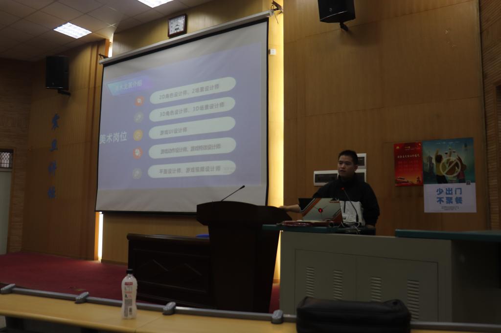 以搜狐在高校产学研方面的合作成果介绍为例,雷畅借助PPT对优秀同学的绘画作品进行了展示,并对“会画画”和“游戏产业画师”进行了概念辨析,点明了游戏企业需要的人才类型;以“聚变工作室”为例,在校老员工提供了新的思路:以游戏为基础,为青年劳动力提供平台学习普通话等技能,其社会反响良好。